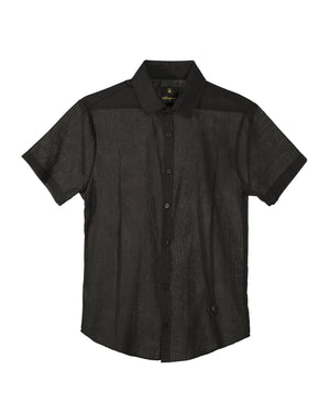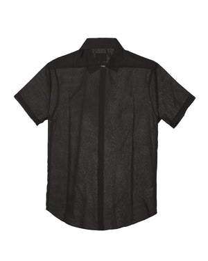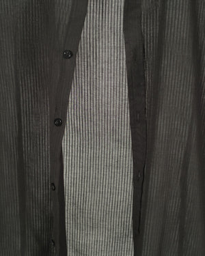 Esta camisa de cuello formal presenta un tejido de líneas delgadas verticales para un look moderno y profesional. La tela con transparencia color negro aporta elegancia y estilo.