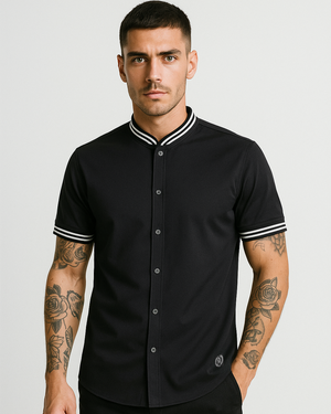 Esta camisa negra de manga corta con cuello cardigan es perfecta para cualquier ocasión. Confeccionada en tela repelente, proporciona una sensación de frescura y protección a los líquidos mientras que su variedad de tallas asegura un ajuste perfecto. ¡Sienta la comodidad y el estilo con esta camisa versátil!