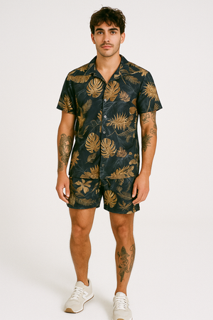 Este conjunto está hecho de una tela de mezclilla suave y ligera. Tiene un estampado de hojas de palmera que le da un toque tropical. El conjunto de short y camisa es perfecto para llevar en cualquier ocasión.