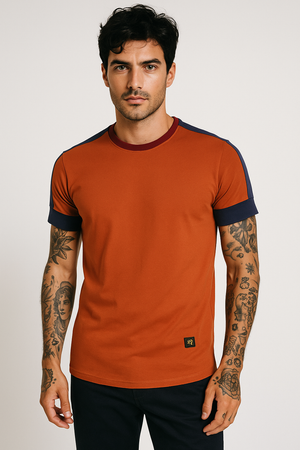 Playera cuello redondo con detalle en manga corta con aplicación en hombros y manga